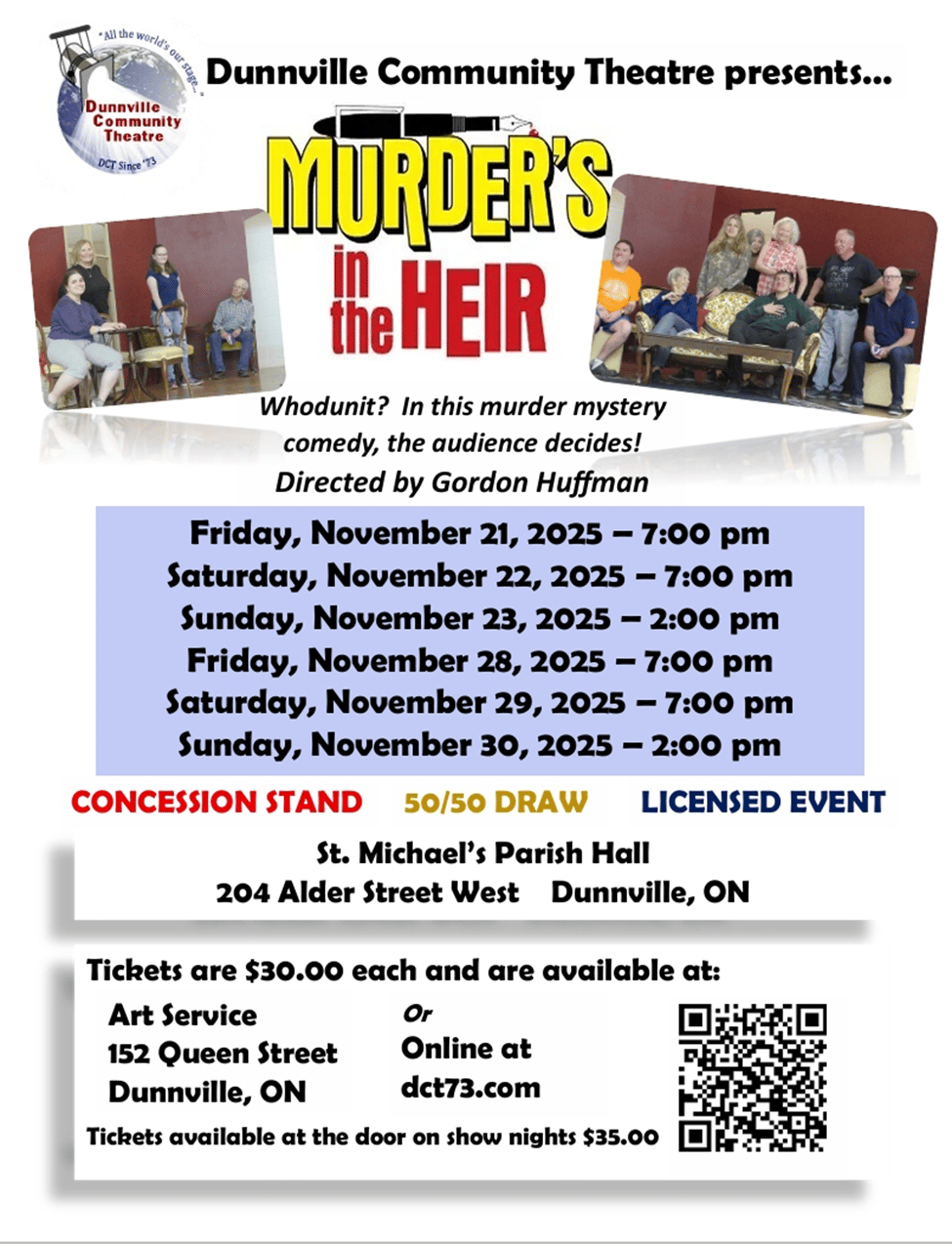 Dunnville Community Theatre presents Murder’s in the Heir, Nov 21 to 23 and 28 to 30 at St. Michael’s Hall. Whodunit, where you pick the culprit.