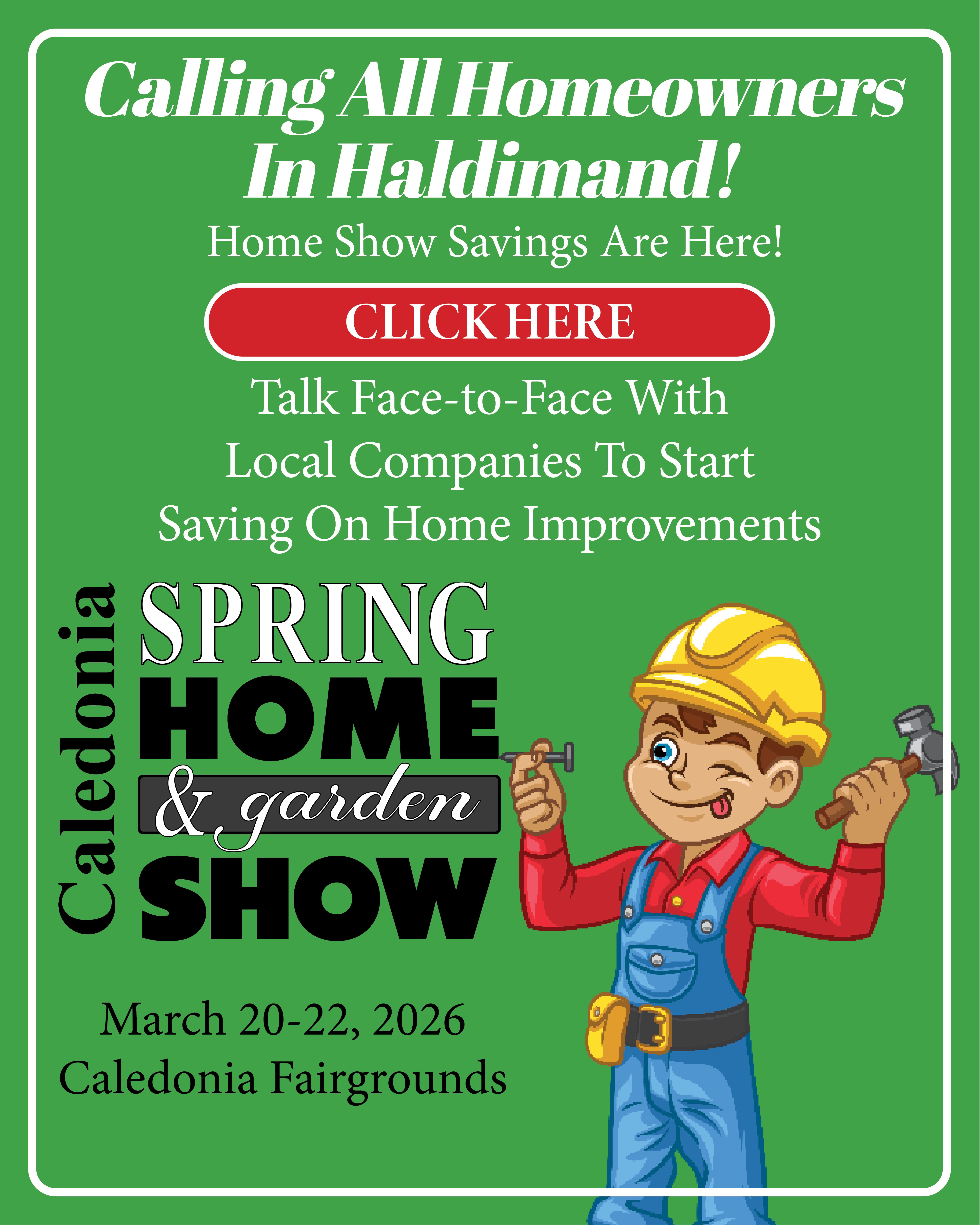 Caledonia Home ShowThe Caledonia Spring Home & Garden Show is coming March 20-22, 2026, to the Caledonia Fairgrounds! The show connects local businesses with local homeowners looking to get a jump on spring projects and increase the value of their home. Take advantage of 'home show exclusive' offers that help you save money on everything for your home. Exhibiting opportunities still available! Call Jenkins Show Productions at 289-337-9095. |