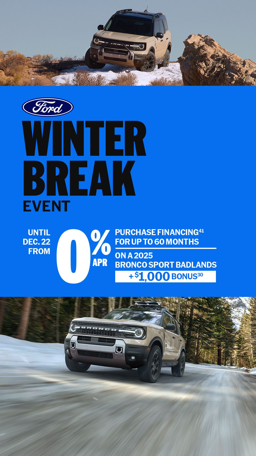 Heaslip FordRight now, get 0% APR purchase financing for up to 60 months on a 2025 Bronco Sport Badlands model, plus an additional $1,000 Dealer Discount and receive a $1,000 Bonus only until December 22nd on eligible Bronco Sport models during the Ford Winter Break Event. Visit HeaslipFord.com today for details. As Haldimand’s longest-serving Ford Dealer since 1910, Heaslip Ford can provide you with quality service you can count on. |